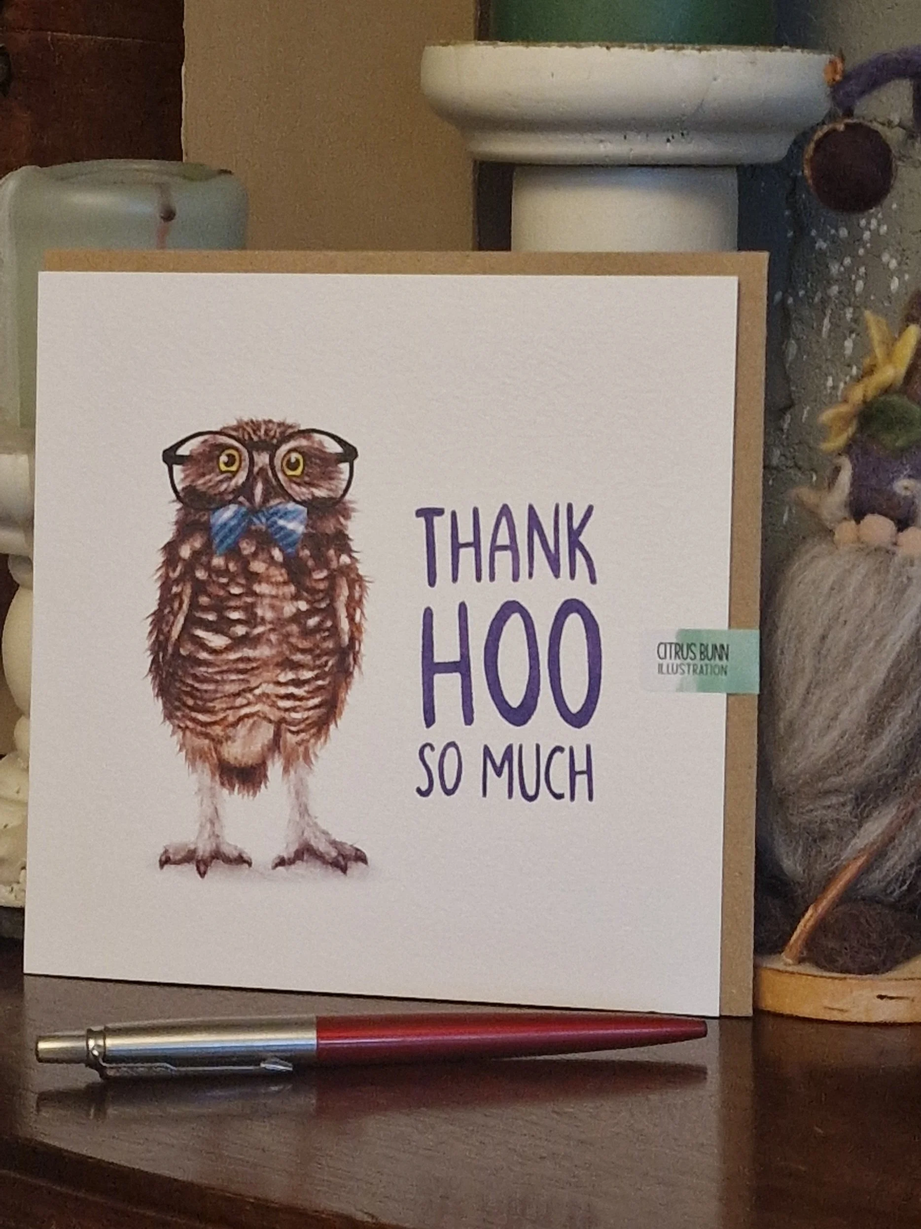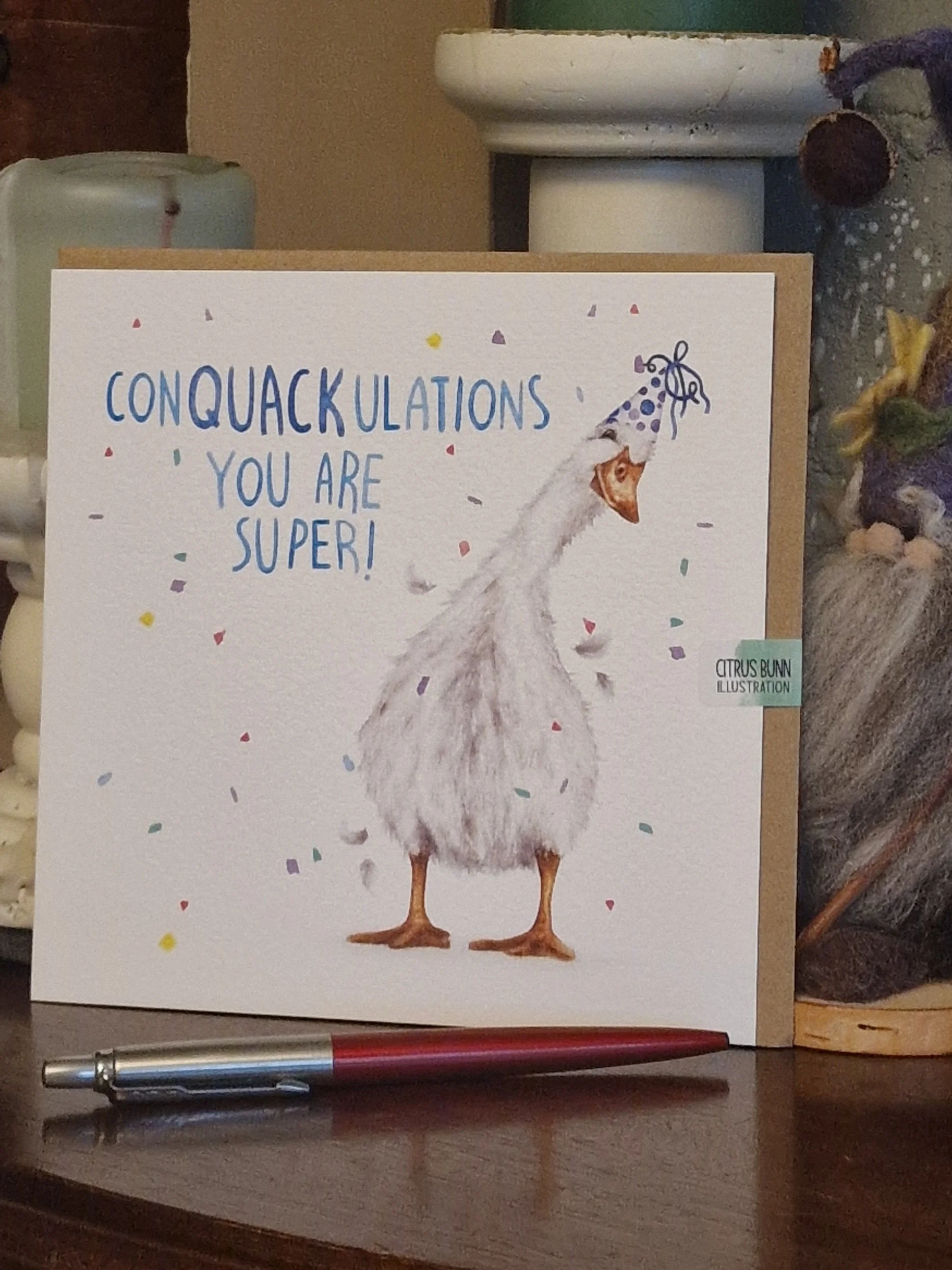 A standard Square Card, printed on high quality FSC-Approved cardstock and paired with a recycled Kraft Paper Envelope.